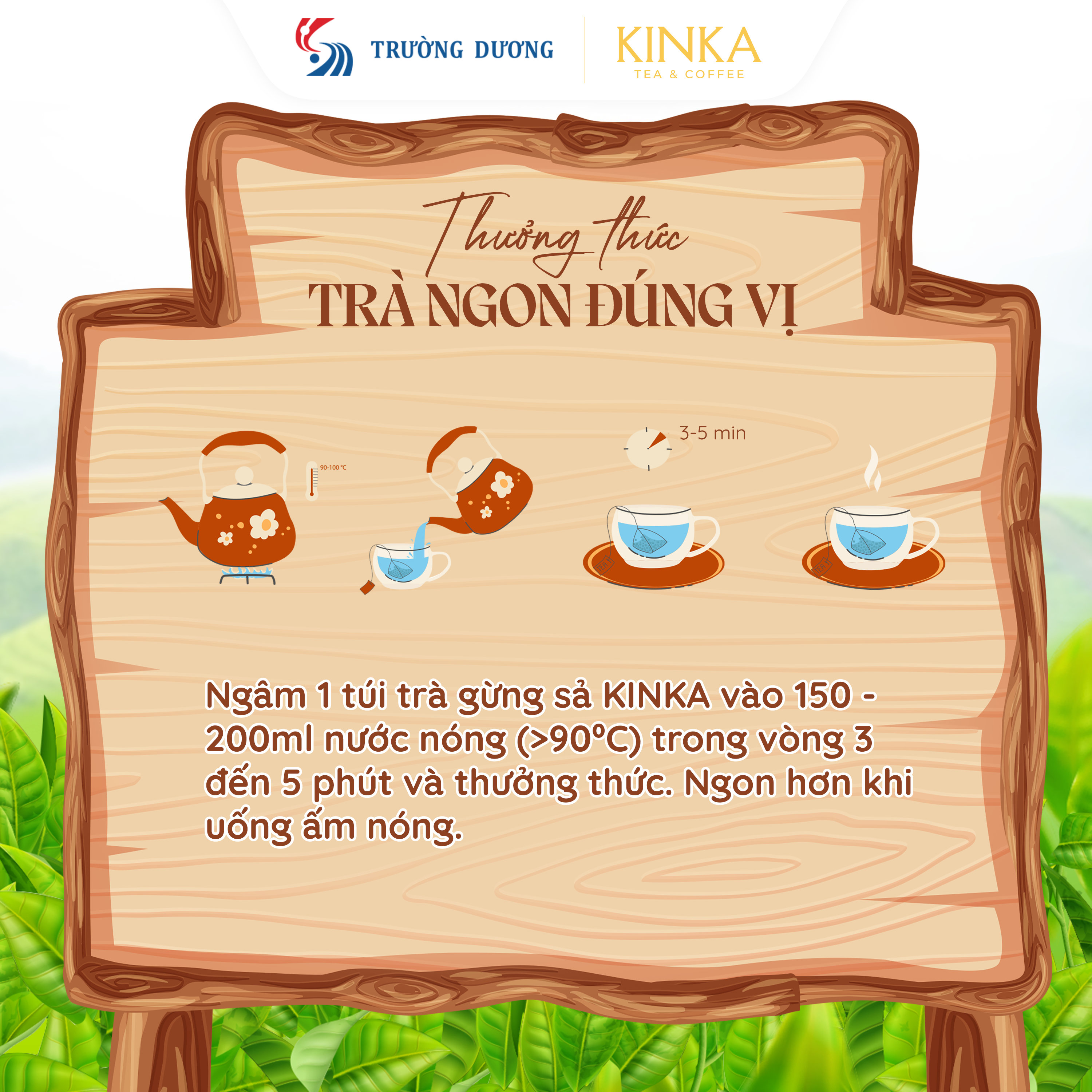 - Ngâm 1 túi trà gừng sả KINKA vào 150 - 200 ml nước nóng (>90°C) trong vòng 3 đến 5 phút và thưởng thức. Ngon hơn khi uống ấm nóng.