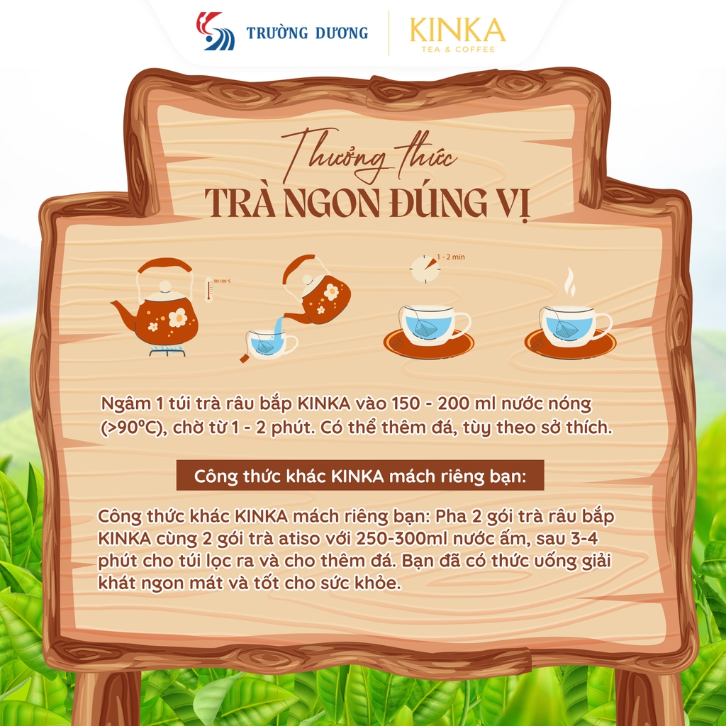 Công thức đặc biệt: Pha 2 gói trà râu bắp KINKA cùng 2 gói trà atiso với 250-300 ml nước ấm. Sau 3-4 phút, cho túi lọc ra và thêm đá để có thức uống giải khát ngon mát và tốt cho sức khỏe.