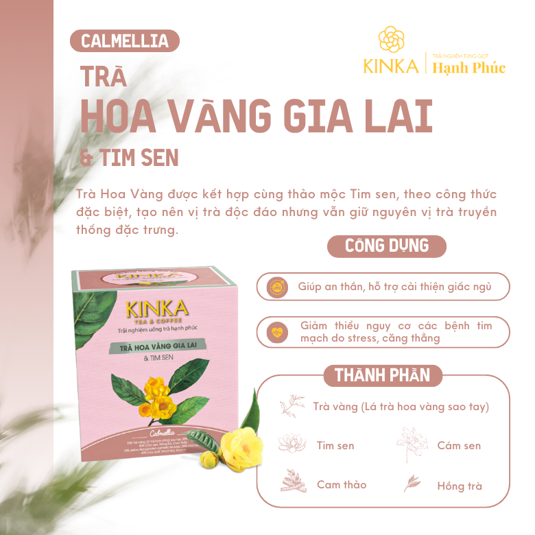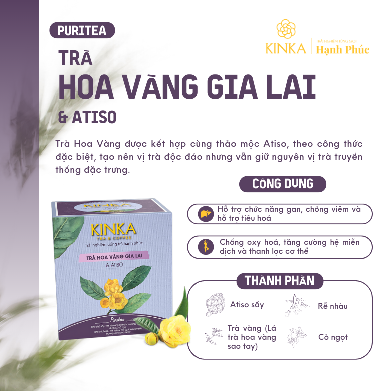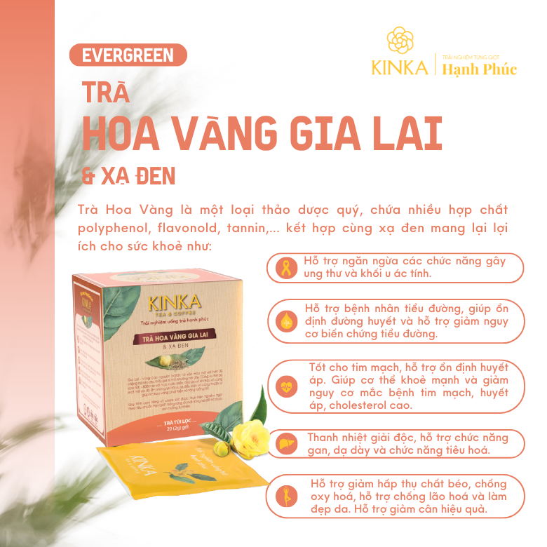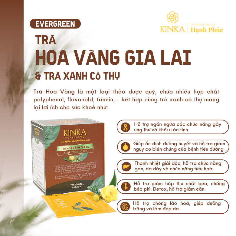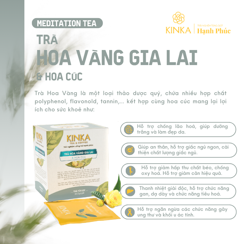 Với sự kết hợp độc đáo giữa Trà Vàng, Trà Xanh và các loại thảo mộc quý giá, Trà Túi Lọc Lá Trà Hoa Vàng KINKA mang đến thức uống thơm ngon, bổ dưỡng, an toàn cho sức khỏe. Sản phẩm phù hợp với mọi lứa tuổi, đặc biệt là những người quan tâm đến sức khỏe và sắc đẹp.